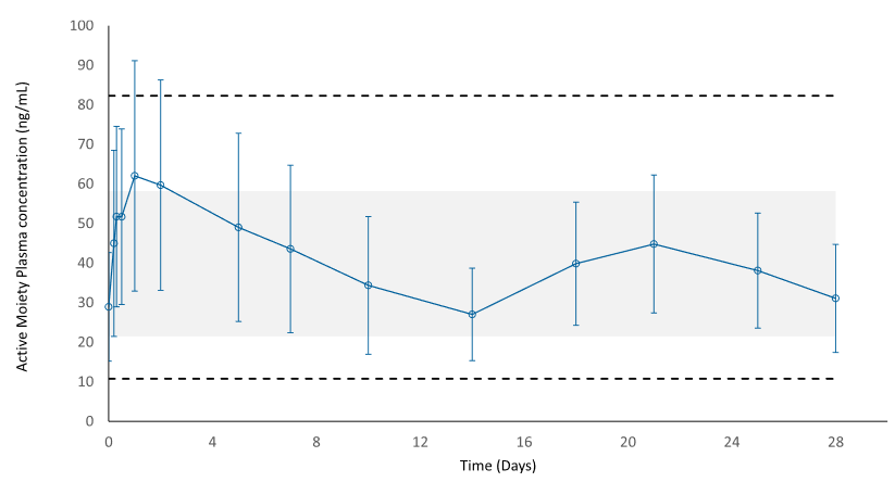 Figure 2 Mean (±SD) plasma concentrations versus time profiles for risperidone active moiety during oral risperidone 4 mg treatment (7th dose) and after switching to risperidone ISM 100 mg (PK population).